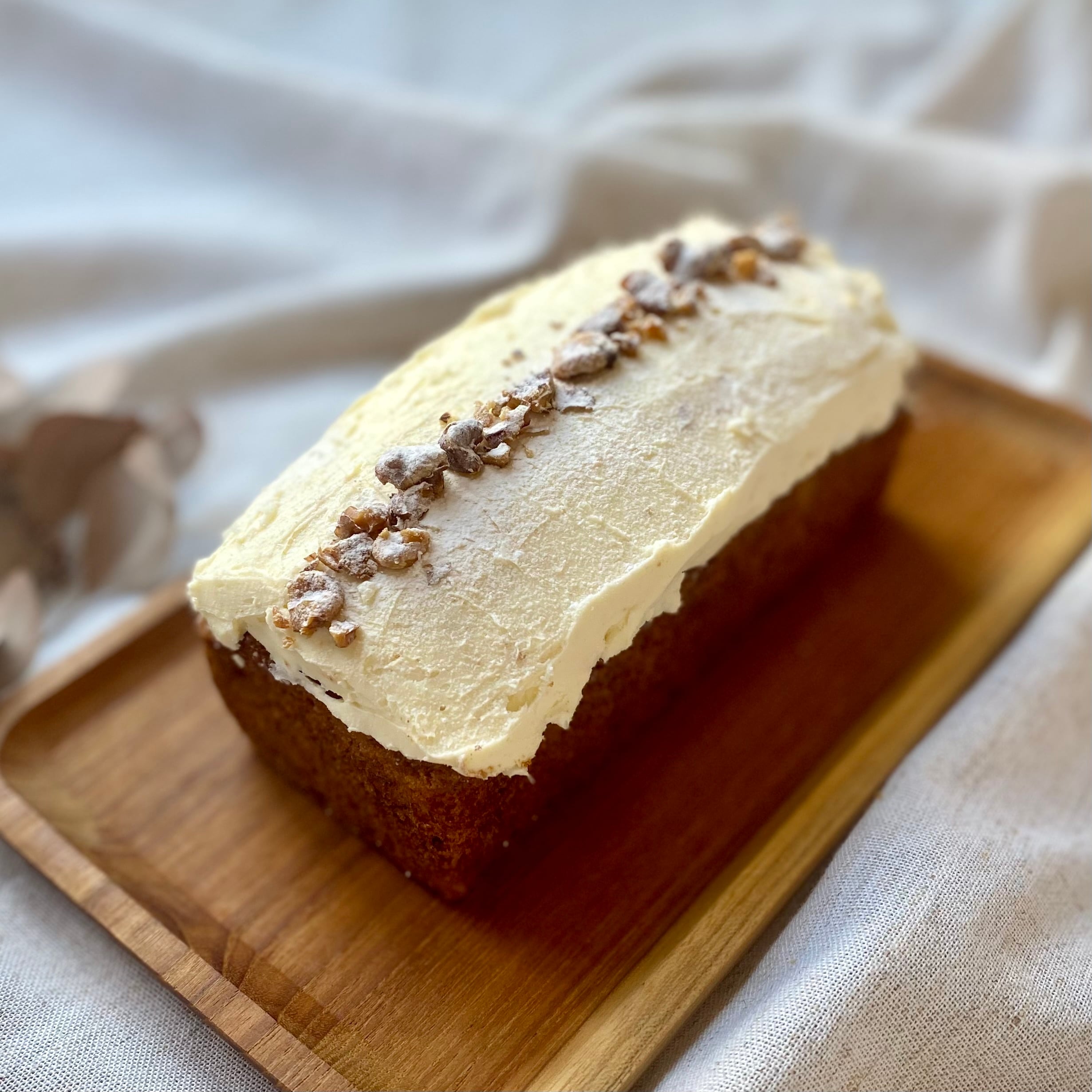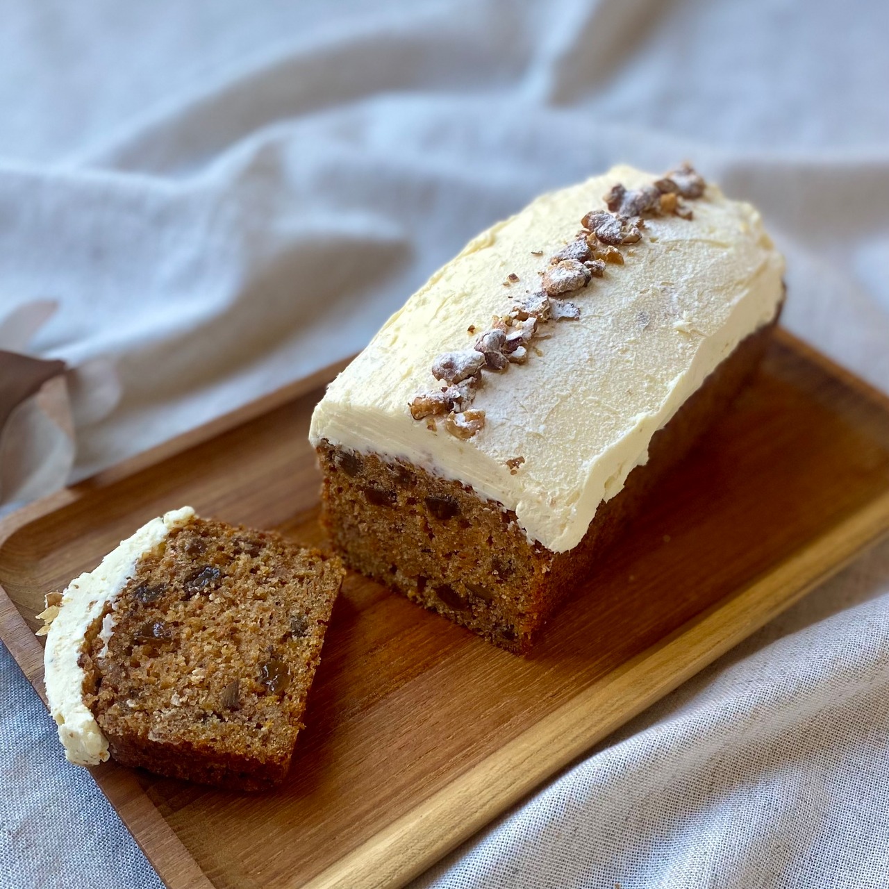 スパイスが効いたキャロットケーキ。イギリス生まれの家庭菓子です。具材はざっくりと刻むことで食感を出し、オイルベース特有のしっとりとした生地とのコントラストが魅力となっています。トップにクリームチーズベースの爽やかなフロスティングをたっぷりとのせました。